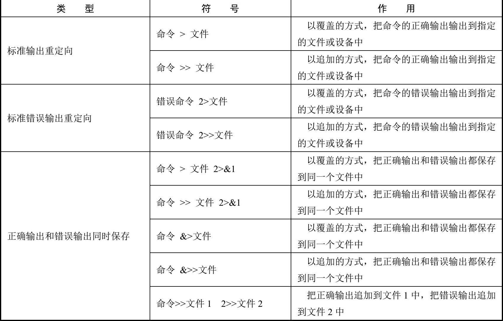 输出重定向指的是把命令的执行结果不再输出到屏幕上,而输出到文件或其他设备中。这样做最大的好处就是把命令的执行结果保存到指定的文件中,在需要的时候可以随时调用。Bash支持的输出重定向符号如表2-5所示。