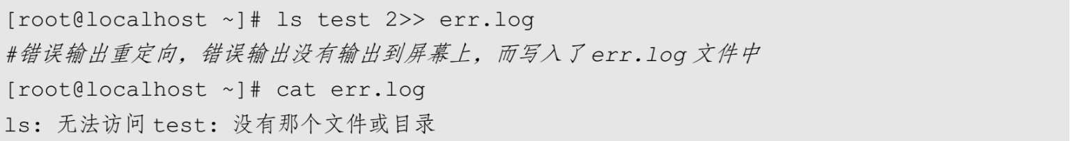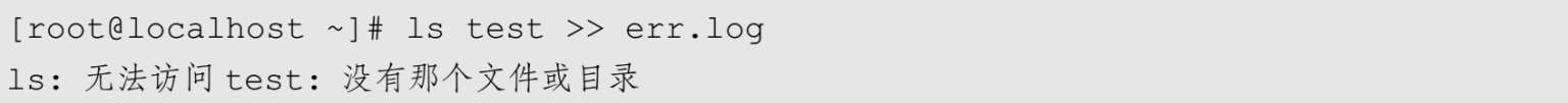 因为在当前目录下没有test文件或目录,所以“ls test”命令报错了。不过,命令的错误输出并没有保存到err.log文件中,而输出到了屏幕上。这时需要这样来写这条命令: