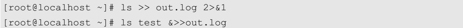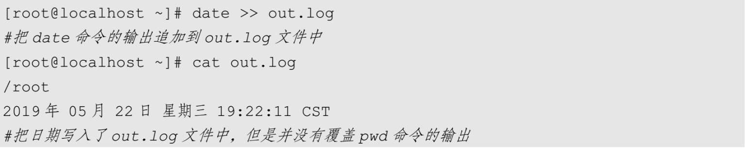在输出重定向中,“>”代表的是覆盖,“>>”代表的是追加。举一个例子: