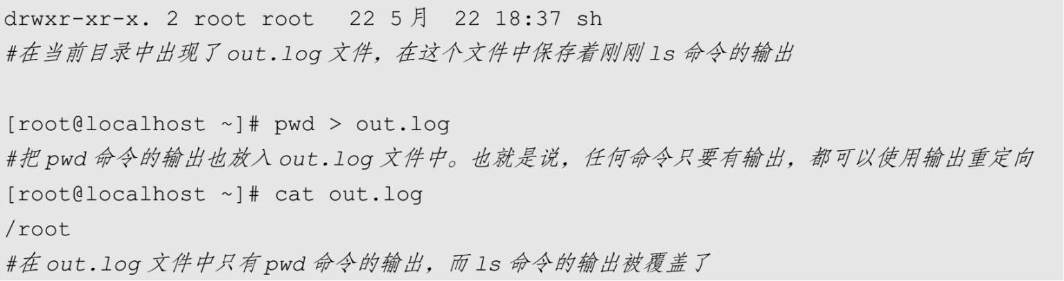 这就是“>”的作用,任何有输出的命令都可以使用输出重定向把命令的输出保存到文件中。不过,覆盖保存会把这个文件中的原有内容清空,所以追加重定向更加实用。