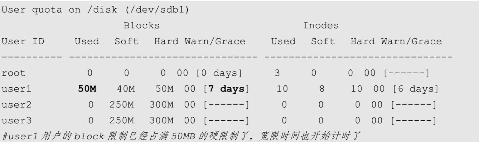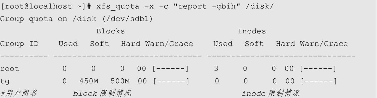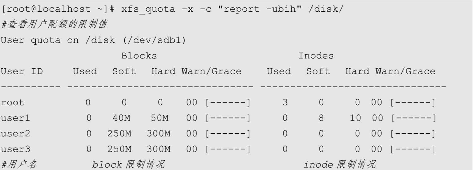要想查看用户组配额的限制值,只要把“-u”选项替换为“-g”选项即可。