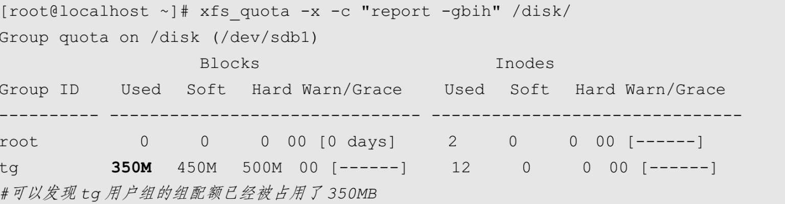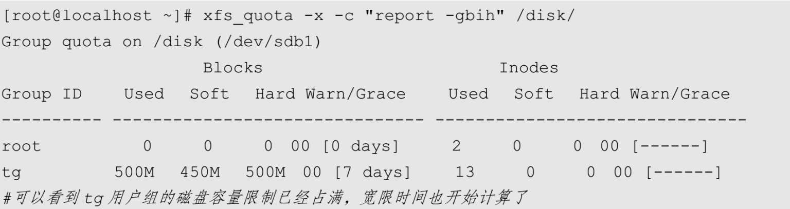 针对tg用户组的磁盘容量硬限制为500MB,软限制为450MB,文件个数没有限制。针对user2和user3用户的磁盘容量硬限制为300MB,软限制为250MB,文件个数没有限制。这样一来,针对user1+user2+user3用户的磁盘容量硬限制为650MB,超出了针对tg用户组的磁盘容量硬限制500MB。