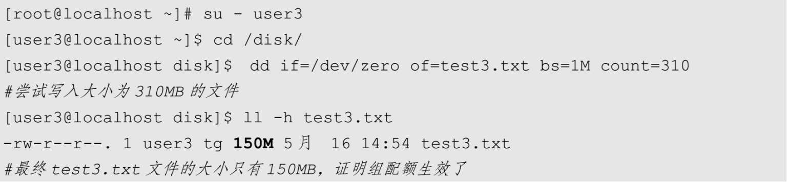 接下来看看user3用户是否可以写满300MB。如果user3用户只能写入150MB,就证明组配额已经生效。另外,组配额不是平均分配空间的,而采用的是先到先得的原则。我们试试: