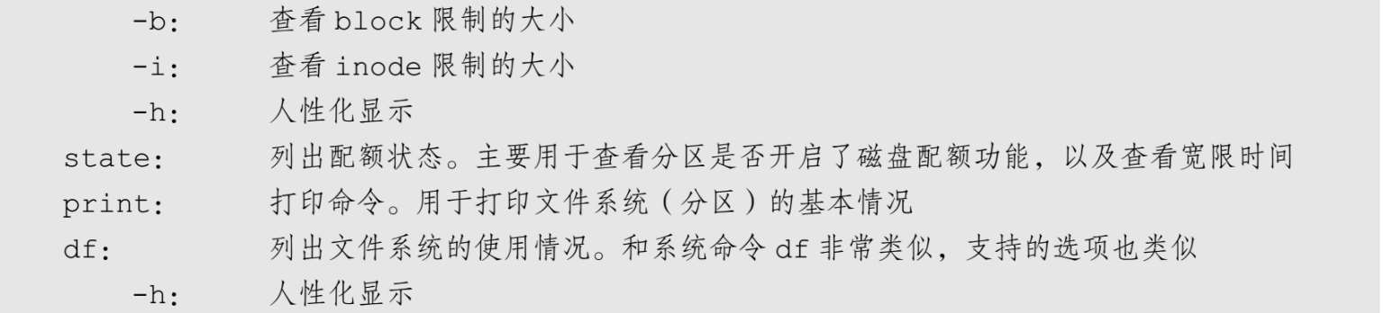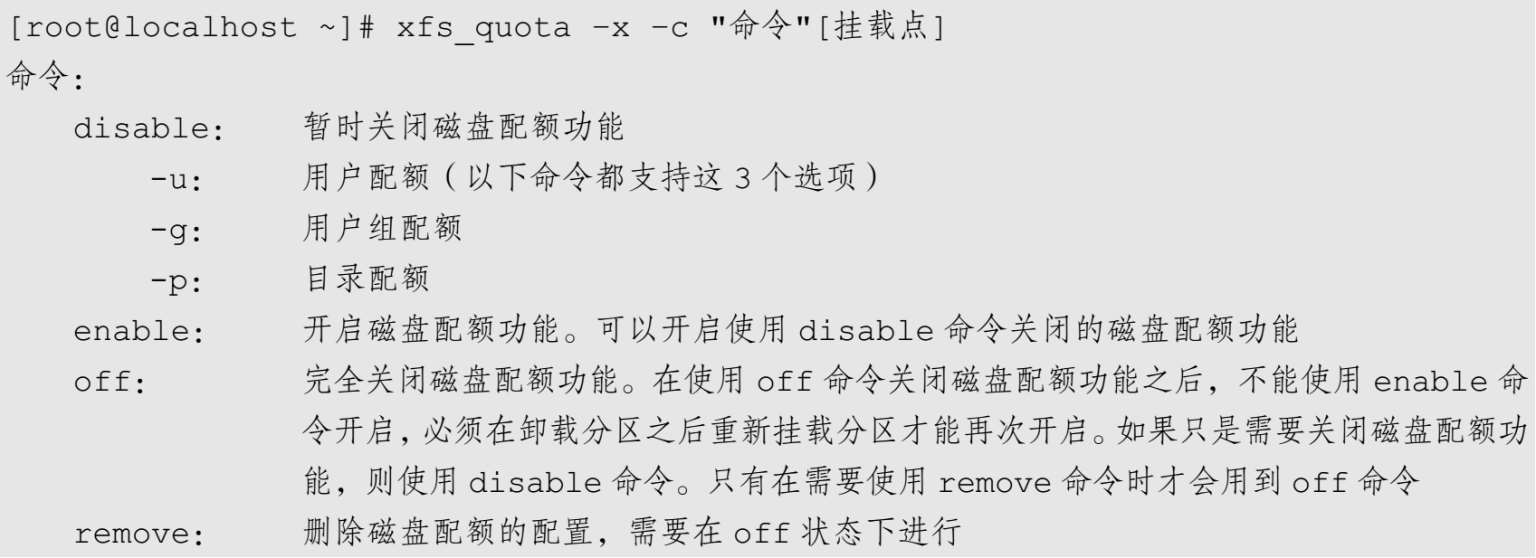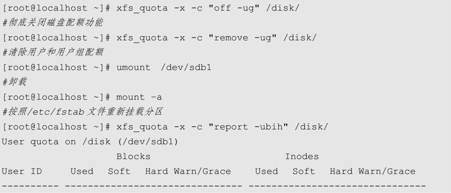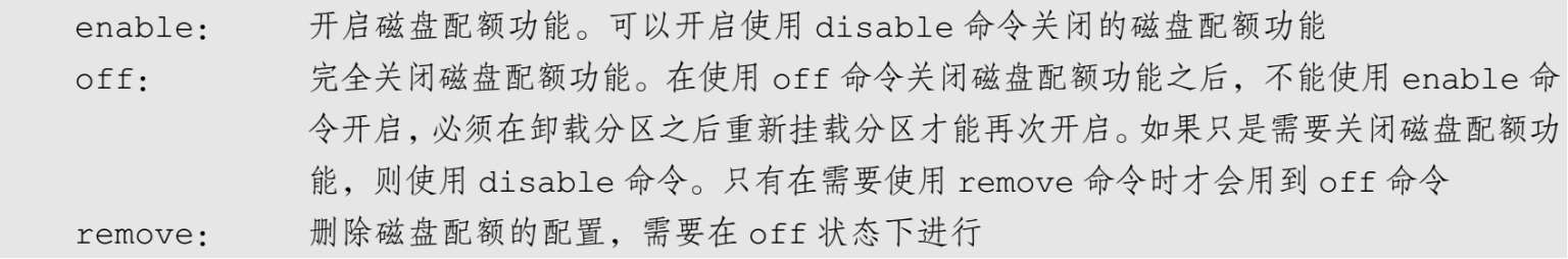 如果需要关闭磁盘配额功能,或者需要删除配额选项,则可以使用以下命令。