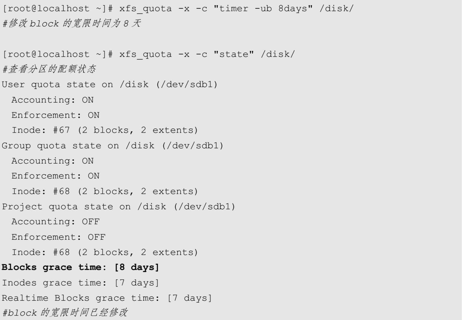 设置宽限时间需要使用xfs_quota命令中的timer命令。命令格式如下: