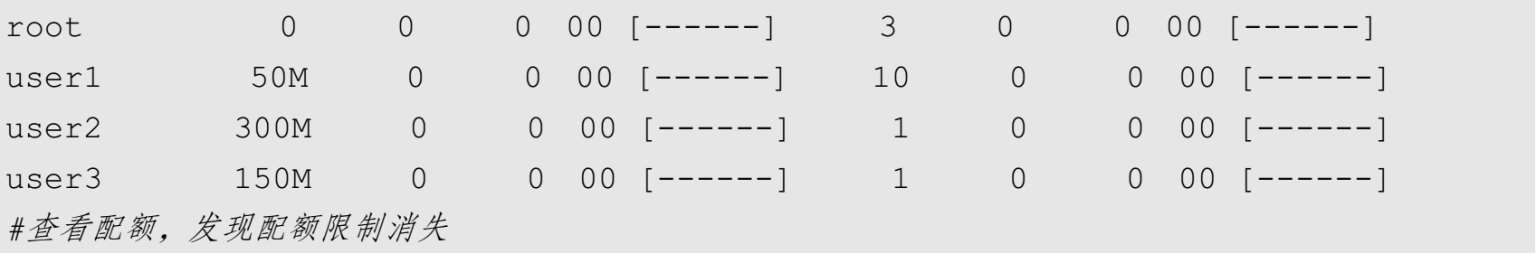 注意: 如果要想测试用户组配额,那么tg用户组必须是user1、user2和user3用户的初始组,用户组配额才能生效;否则用户组配额不起作用。
