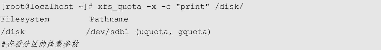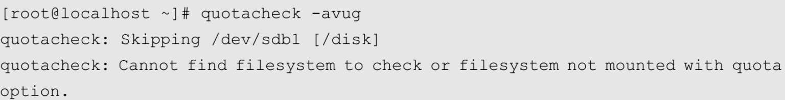 注意: 这里的报错英文原意是“找不到检测的文件系统或文件系统没有挂载磁盘配额选项”。很多读者以为引起这个报错的原因是分区没有开启磁盘配额功能,或者内核没有开启磁盘配额模块。其实都不是,真实的原因是XFS文件系统不再使用quotacheck命令来进行磁盘配额,而需要使用xfs_quota命令来进行磁盘配额。