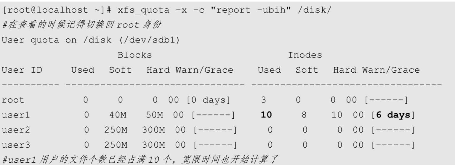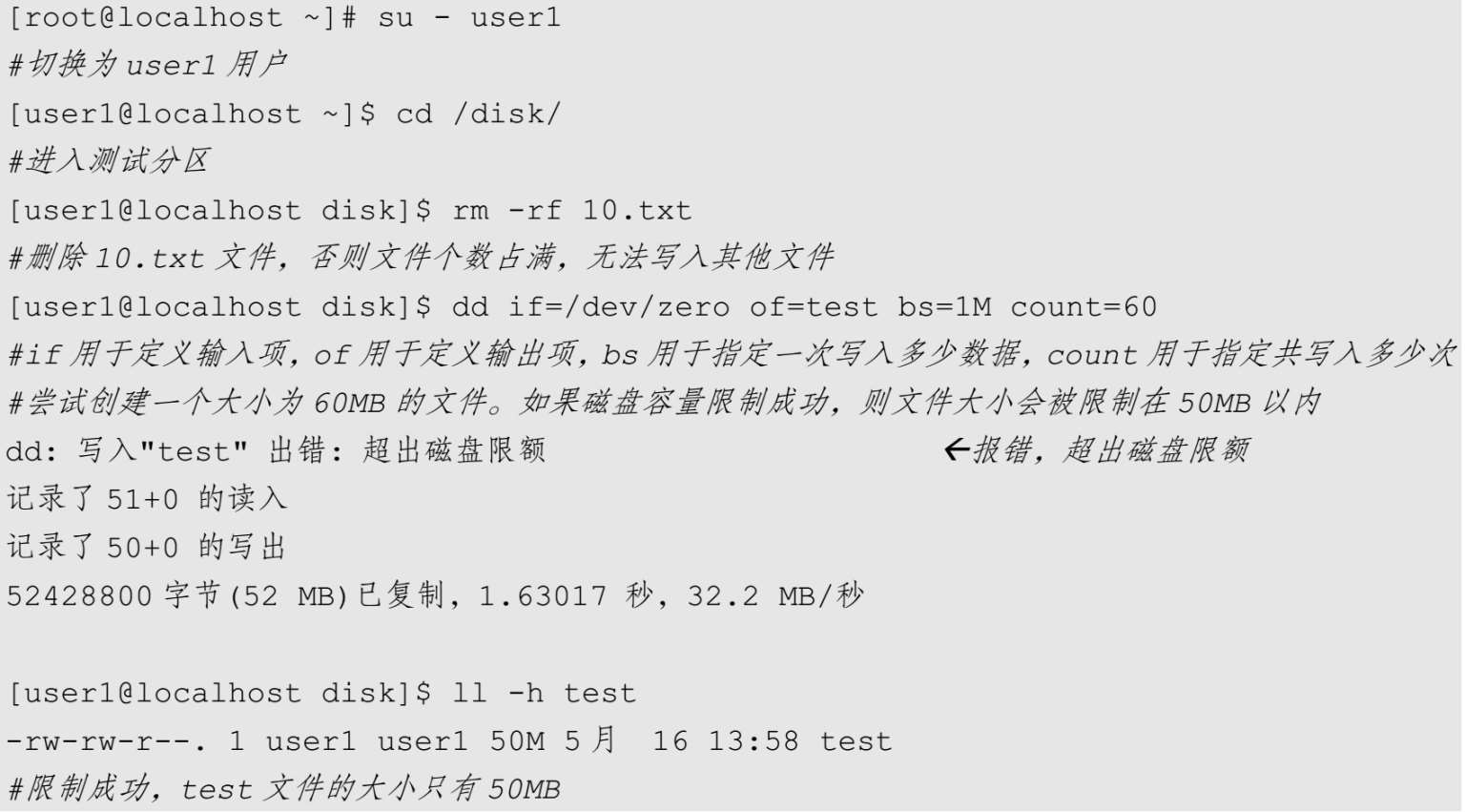 再测试针对user1用户的磁盘容量限制是否生效。命令如下: