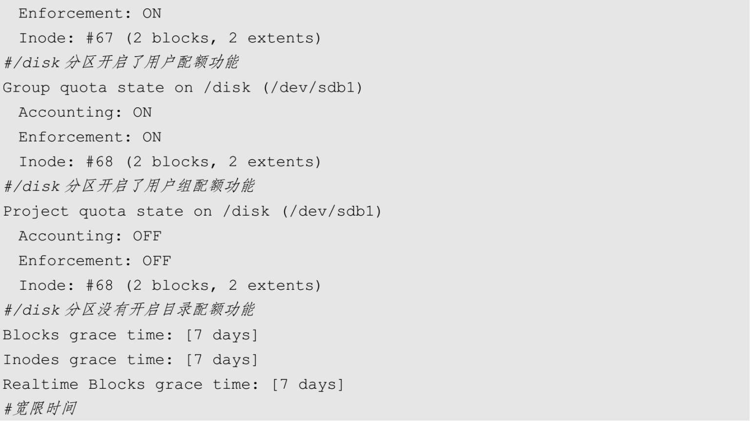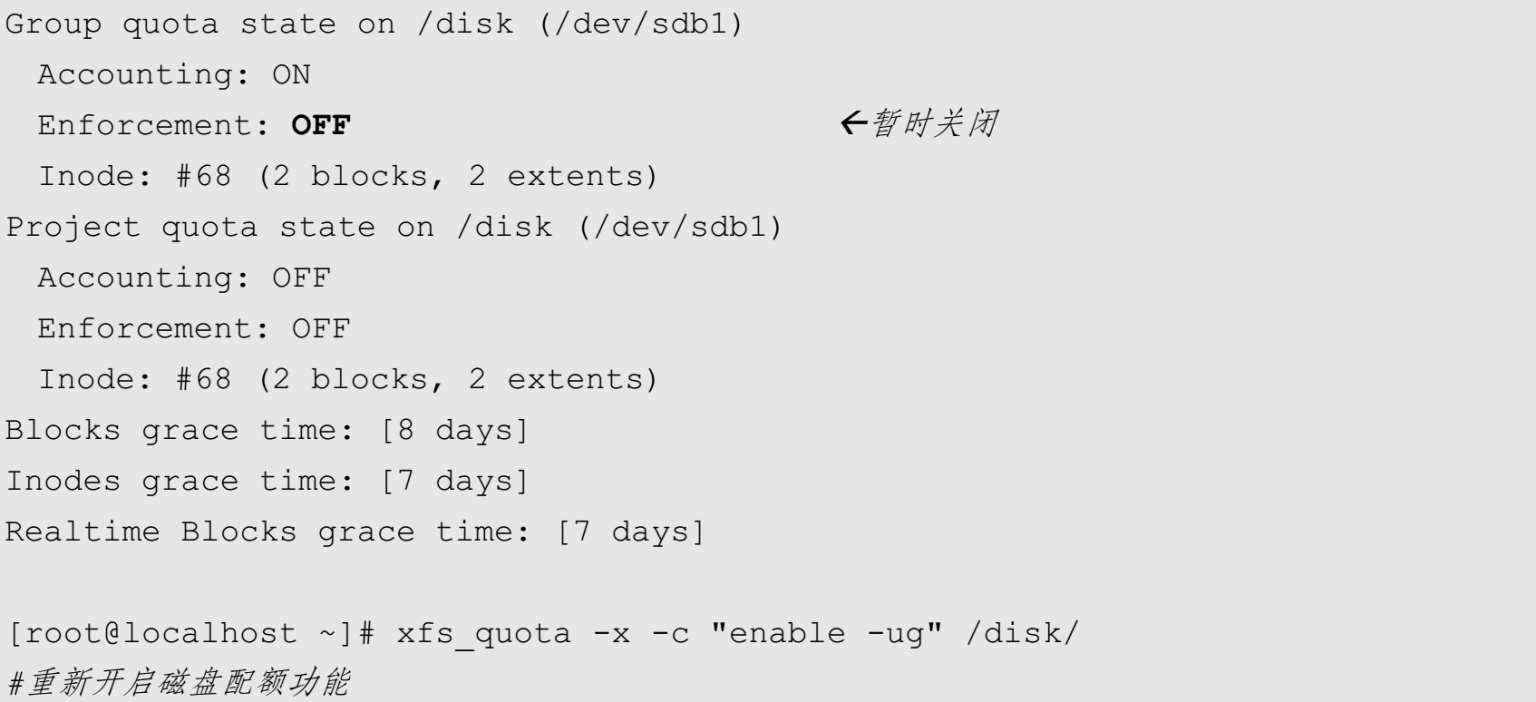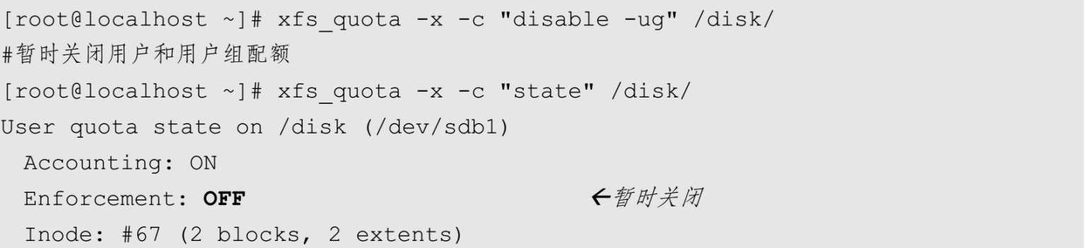 如果需要暂时关闭磁盘配额功能,但是不清除配额的各项限制,则可以直接使用disable命令关闭,也可以使用enable命令重新开启。