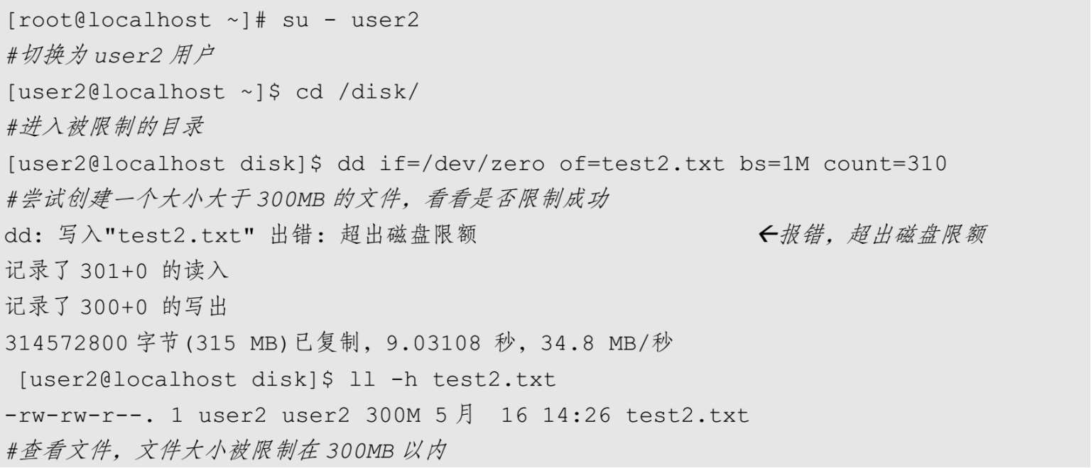 我们来看看会出现什么情况。先测试针对user2用户的磁盘容量限制。命令如下: