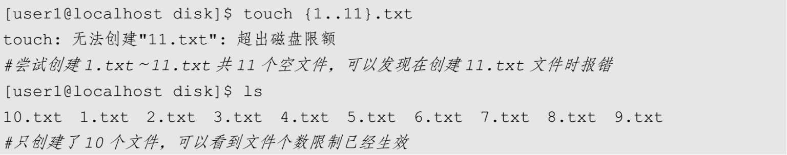 先尝试一下文件个数限制,看看是否被限制。针对user1用户,磁盘容量硬限制为50MB,软限制为40MB;文件个数硬限制为10个,软限制为8个。验证一下: