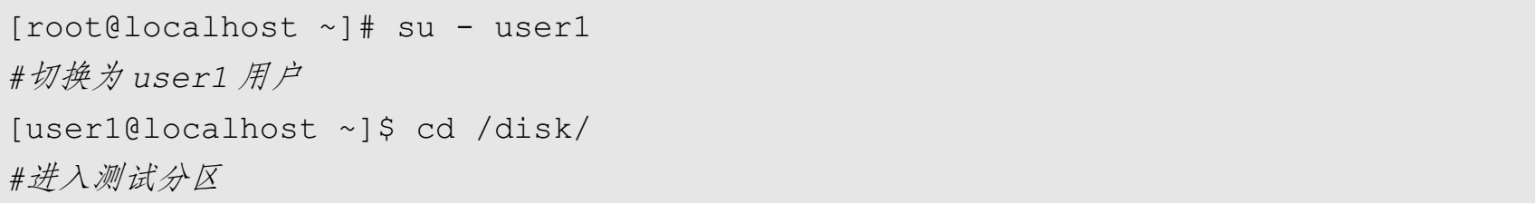 磁盘配额设置成功后,需要测试一下,看看是否生效。首先需要修改/disk分区的权限,让user1、user2和user3用户对这个分区拥有写入权限。命令如下: