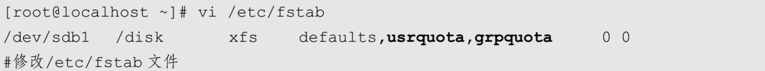 注意: 这里加入的是“usrquota”和“grpquota”这样两个不常见的缩写单词,中间用逗号隔开。在修改/etc/fstab文件时一定要小心,因为一旦改错,就有可能导致系统无法正常启动。