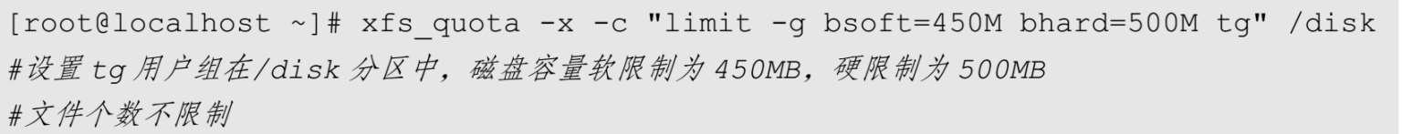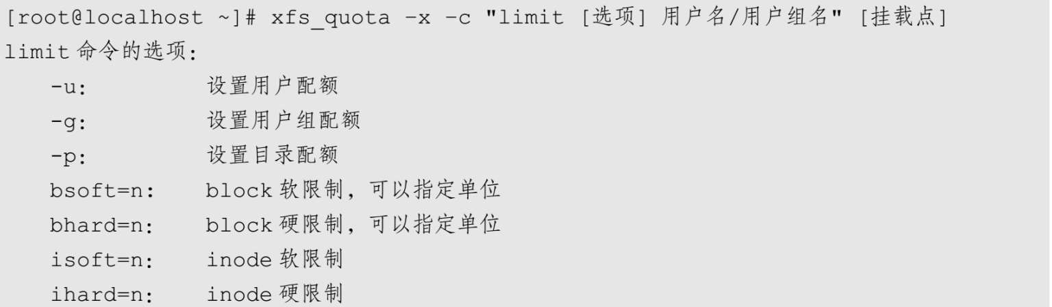 xfs_quota命令确实比较复杂,我们逐个命令来使用。先来看看如何设置用户与用户组配额,需要使用xfs_quota命令中的limit命令。
