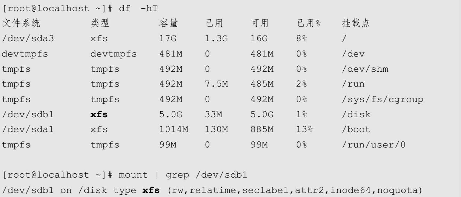 我们按照实验规划,划分容量为5GB的/dev/sdb1分区(划分分区的过程在《细说Linux基础知识》中已经详细介绍过,在这里直接看结果),并将它挂载到/disk目录中,然后查看这个分区。命令如下: