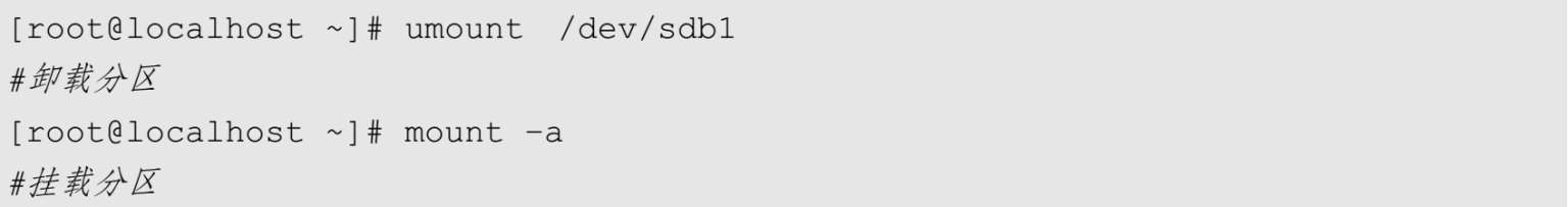 在开启分区的磁盘配额功能之后,还需要卸载分区,再重新挂载分区。命令如下: