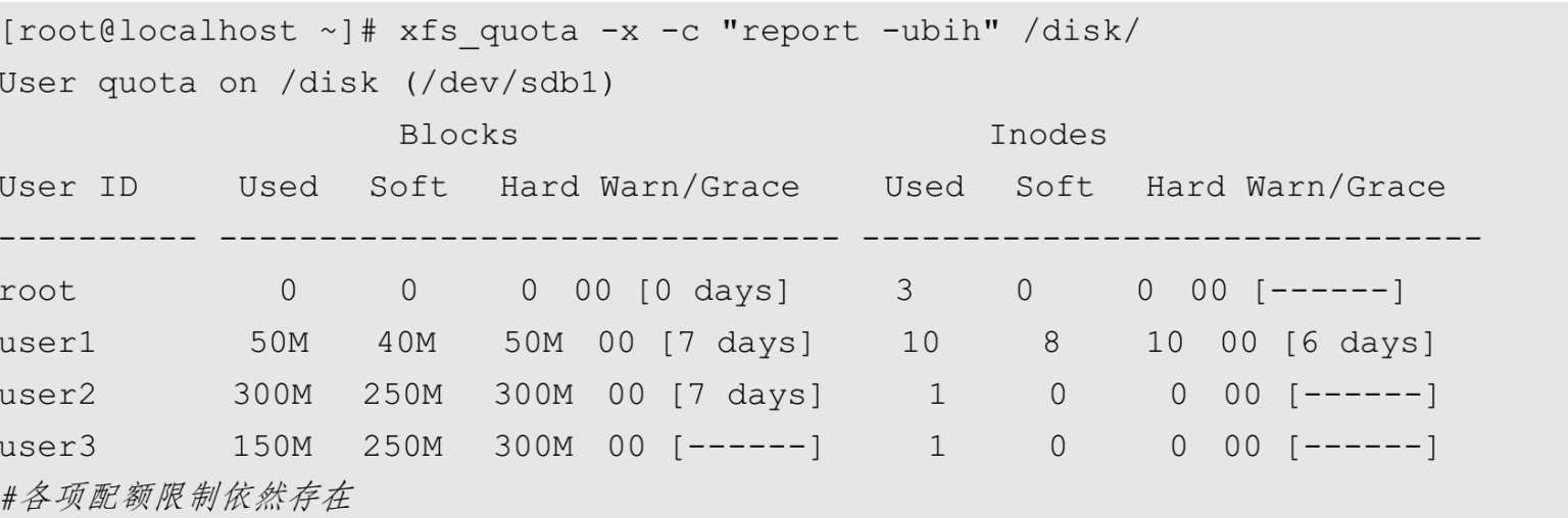 知道了xfs_quota命令中limit命令的格式,就可以按照实验规划来设置我们的配额实验了。先设置用户配额。