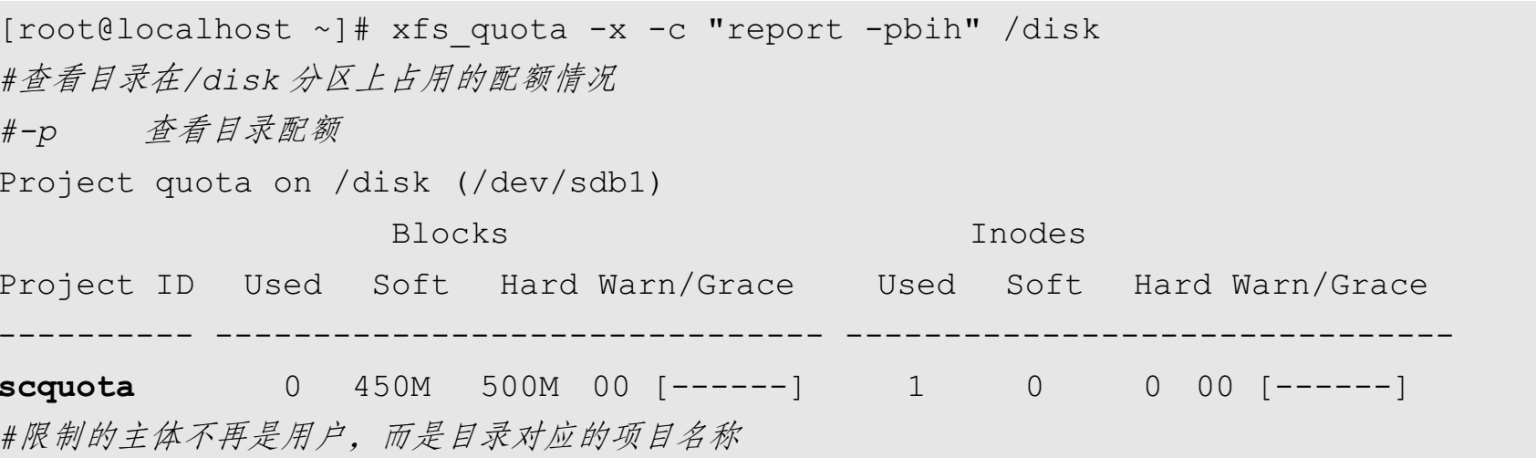 目录配额是XFS文件系统中新增的功能,限制的是目录在本分区中占用的磁盘空间大小,限制的主体是目录。这时,不论是超级用户还是普通用户,在目录中占用的磁盘空间大小和文件个数都受配额限制。也就是说,目录配额可以限制超级用户。