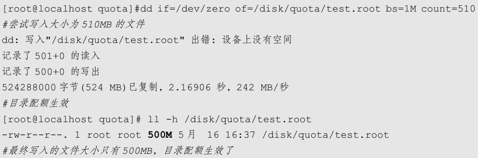 目录配额限制的是目录在本分区中占用的磁盘空间大小,限制的主体是目录。所以,不论是什么身份,哪怕是root用户写入也会受到限制。下面用root用户来测试一下。