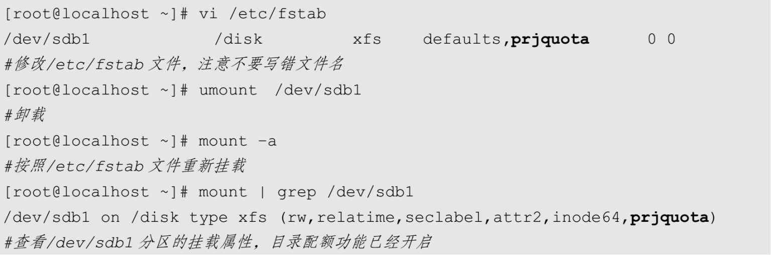 首先需要开启分区的目录配额项。在之前的实验中已经清除了用户和用户组配额,在这里重新配置目录配额。