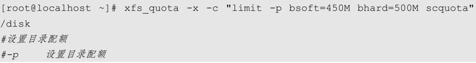 给实验目录/disk/quota设置磁盘容量硬限制为500MB,软限制为450MB。设置目录配额限制的命令依然是xfs_quota命令中的limit命令,选项也和之前的选项一致。