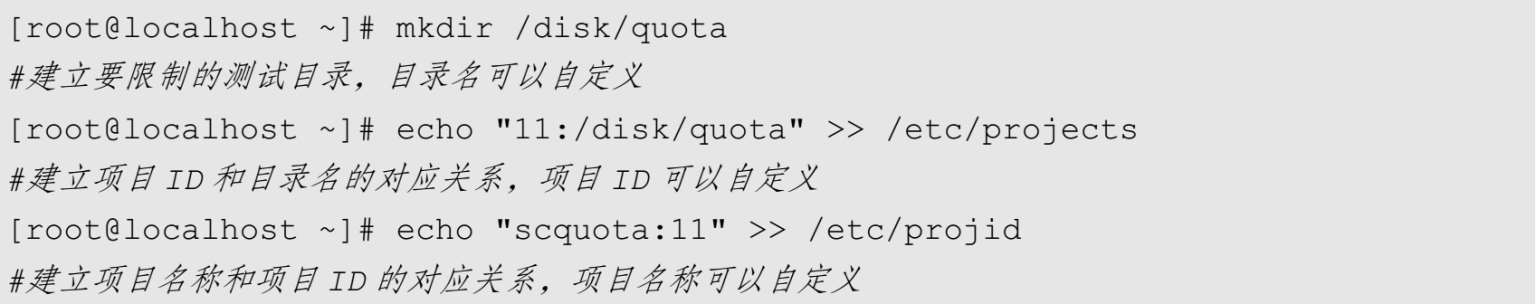 如果需要做目录配额,则需要给目录起一个项目名称和项目ID,而且需要写入/etc/projects和/etc/projid这两个文件中。需要注意的是,这两个文件默认不存在,需要手工建立。注意不要写错文件名,否则实验会失败。