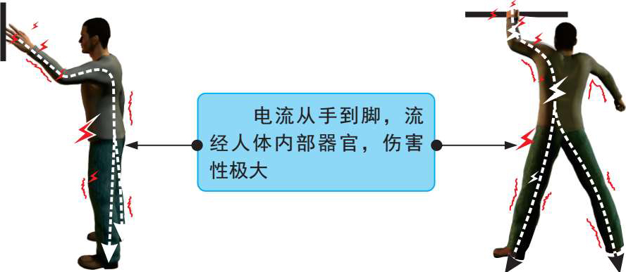 电击是电流通过人体内部造成内部器官,如心脏、肺部和中枢神经等损伤。电流通过心脏时的危害性最大。相比较来说,电击比电伤造成的危害更大,如图2-2所示。