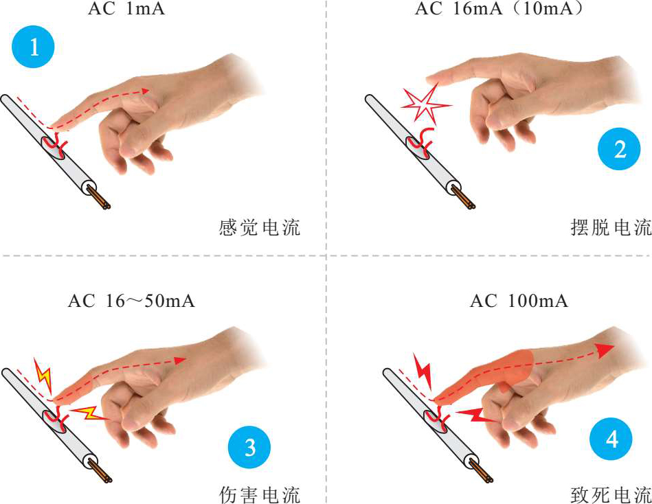 触电电流是造成人体伤害的主要原因。触电电流的大小不同,引起的伤害也会不同。触电电流按照伤害大小可分为感觉电流、摆脱电流、伤害电流和致死电流,如图2-1所示。