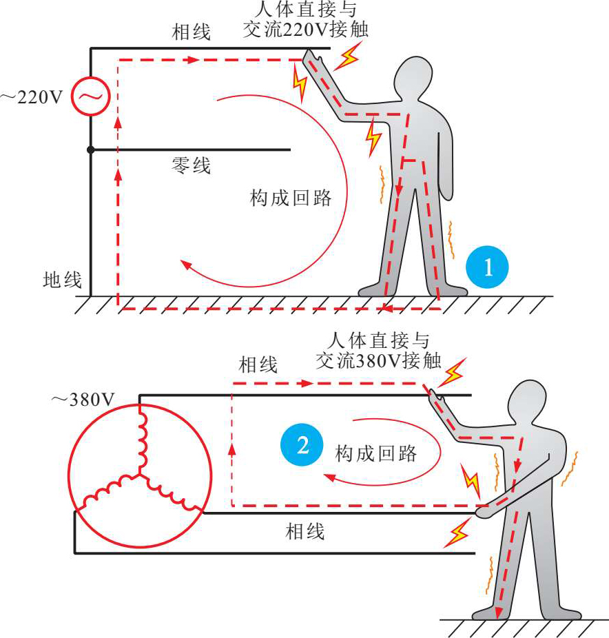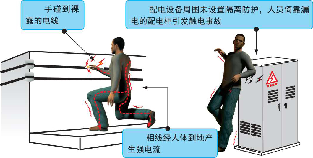 人体是导体,人体组织的60%都是由含有水分的导电物质组成的。当人体接触设备的带电部分并形成电流通路时,就会有电流流过人体并造成触电。图2-3为人体触电的原因。