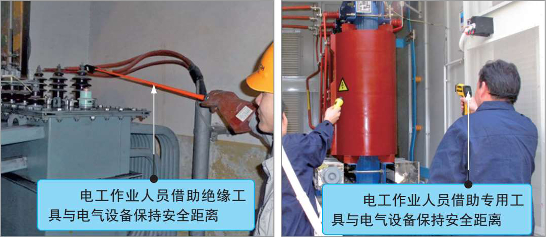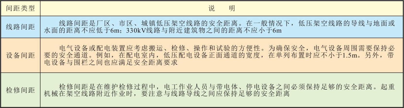 间距是在电工作业时,电工作业人员与设备之间、带电体与地面之间、设备与设备之间应保持的安全距离,如图2-14所示。正确的间距可以防止人体触电、电气短路、火灾等事故的发生。
