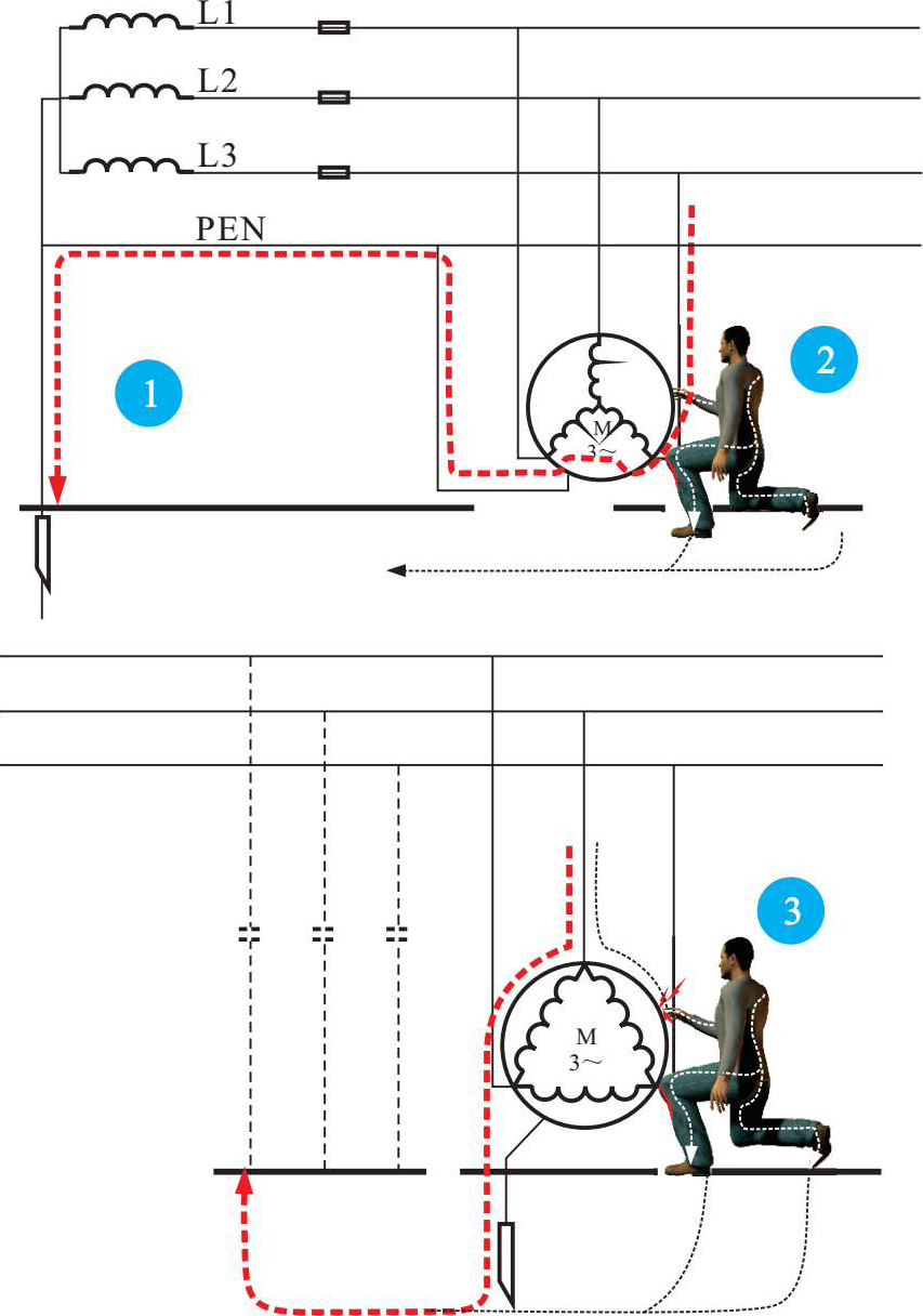 2 当某相带电部分碰到电气设备的金属外壳时,通过设备外壳形成对零线的单相短路回路,由于短路电流较大,能够在最短的时间内保护装置或自动跳闸,从而切断电流,保障人身安全。