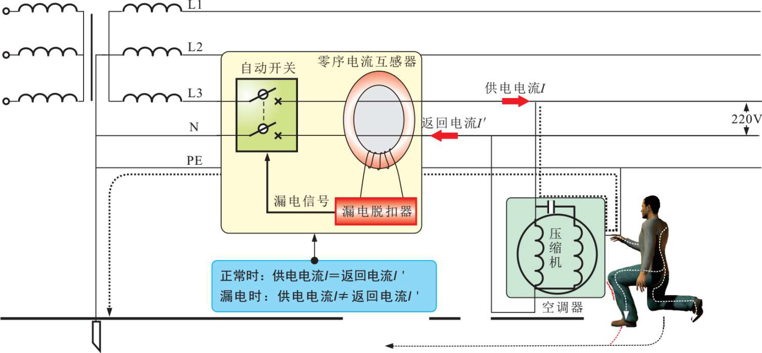 漏电是电气设备或线路绝缘损坏或因其他原因造成导电部分破损时,如果电气设备的金属外壳接地,此时电流就由电气设备的金属外壳经大地构成通路,形成电流,即漏电电流。当漏电电流达到或超过规定允许值(一般不大于30mA)时,漏电保护器件能够自动切断电源或报警,可保证人身安全,如图2-16所示。