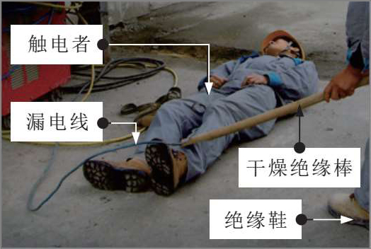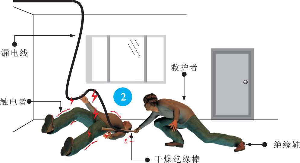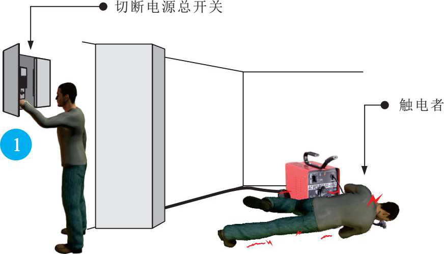触电事故发生后,救护者要保持冷静,首先观察现场,推断触电原因,然后采取最直接、最有效的方法实施救援,让触电者尽快摆脱触电环境,如图2-18所示。