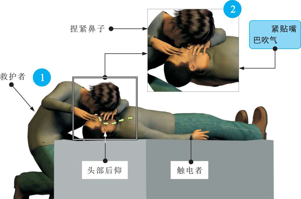 1 救护者首先深吸一口气,紧贴着触电者的嘴巴大口吹气,使其胸部膨胀,然后换气,放开触电者的鼻子,使触电者自动呼气,如此反复,吹气时间为2~3s,放松时间为2~3s,5s左右为一个循环。重复操作,中间不可间断,直到触电者苏醒为止。