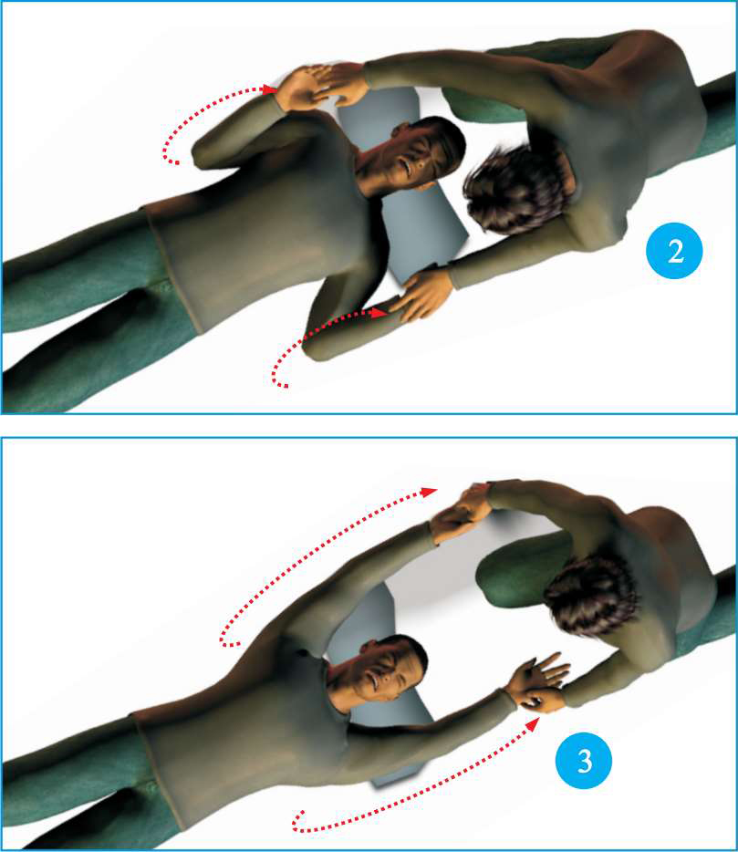 2 救护者蹲跪在触电者头部附近,两只手握住触电者的手腕,让触电者两臂在胸前弯曲,让触电者呼气。注意,在操作过程中用力不要过猛。