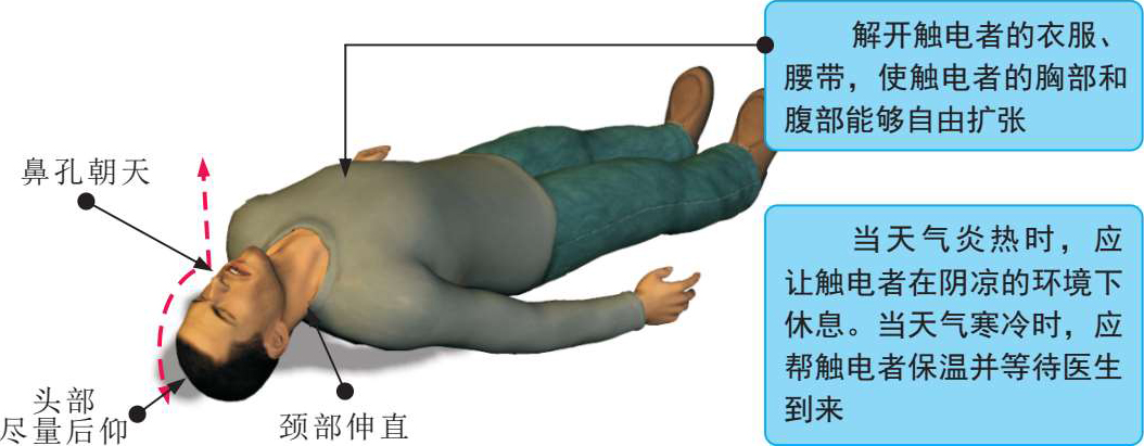 若触电者已经失去知觉,但仍有轻微的呼吸和心跳,应让触电者就地仰卧平躺,让气道通畅,解开触电者的衣服及有碍于呼吸的腰带等,呼叫触电者或轻拍触电者肩部,判断触电者意识是否丧失。在触电者神志不清时,不要摇动触电者的头部或呼叫触电者。