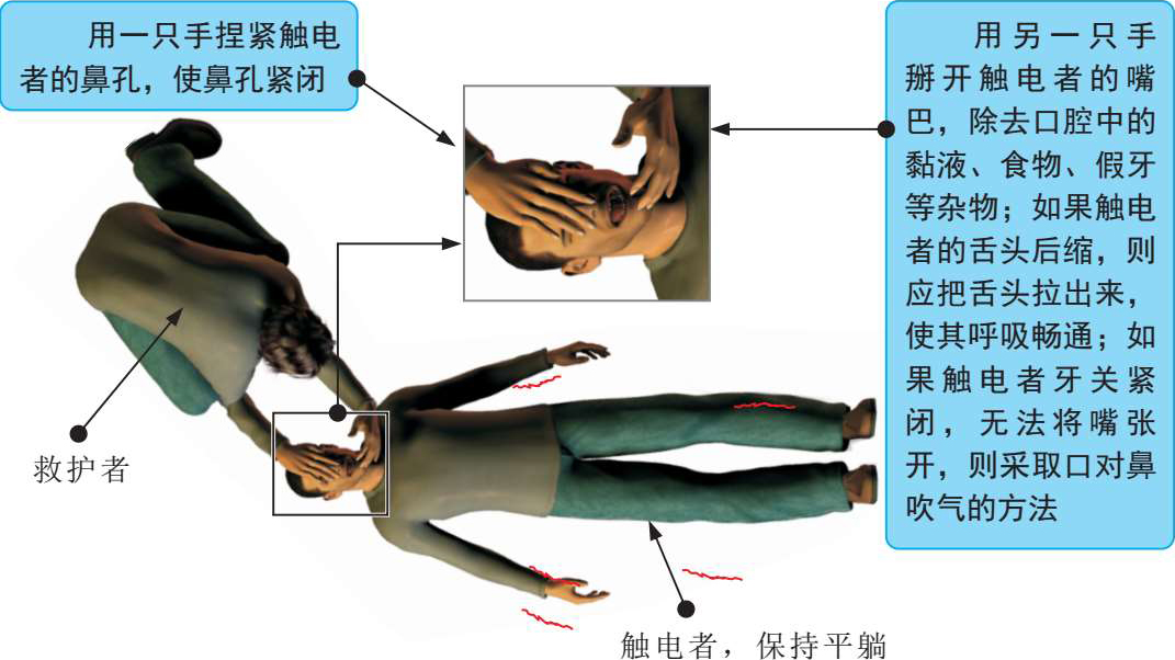 在通常的情况下,若正规医疗救援不能及时到位,而触电者已无呼吸,但是仍然有心跳时,应及时采用人工呼吸法救治。