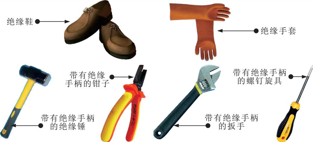绝缘手套、绝缘鞋及各种维修工具的绝缘手柄都可以起到绝缘防护的作用,如图2-11所示。其绝缘性能必须满足国家现行的绝缘标准。