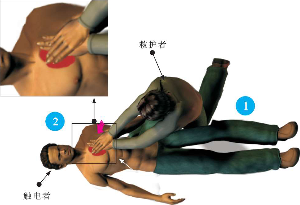 在触电者心音微弱、心跳停止或脉搏短而不规则的情况下,可采用胸外心脏按压法帮助触电者恢复正常心跳,如图2-24所示。