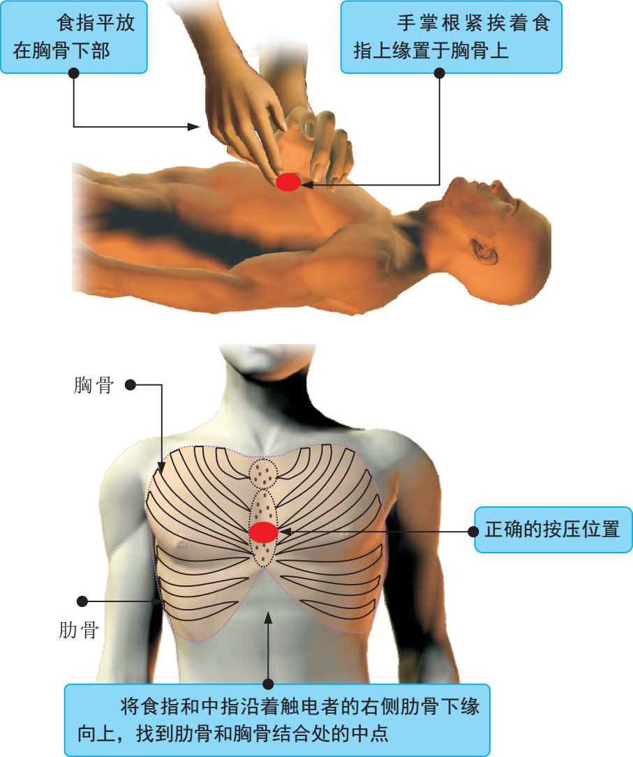寻找正确的按压点:可将右手食指和中指沿着触电者的右侧肋骨下缘向上,找到肋骨和胸骨结合处的中点,如图2-25所示。