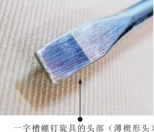 一字槽螺钉旋具的头部为薄楔形头,主要用于拆卸或紧固一字槽螺钉,使用时要选用与一字槽螺钉规格相对应的一字槽螺钉旋具。