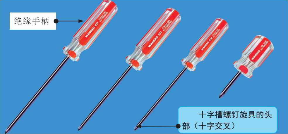 图3-14为十字槽螺钉旋具的实物外形。十字槽螺钉旋具的头部由两个薄楔形片十字交叉构成,主要用于拆卸或紧固十字槽螺钉。