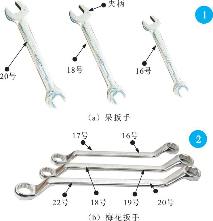 图3-18为固定扳手的实物外形。常见的固定扳手主要有呆扳手和梅花扳手两种。