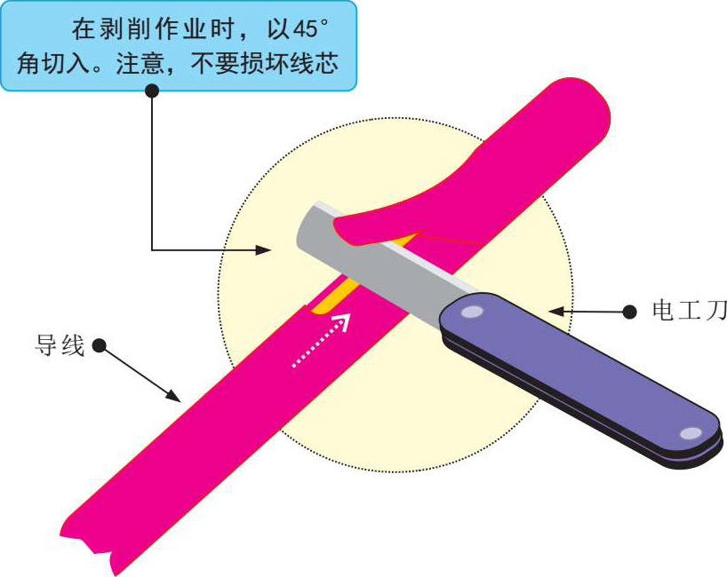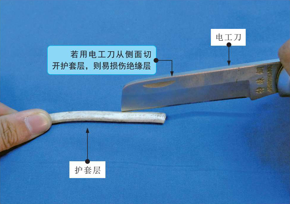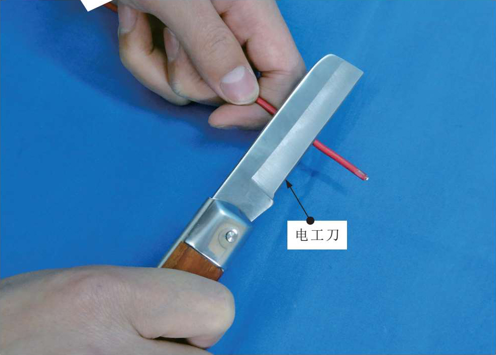 在使用电工刀时要特别注意用电安全,切勿在带电的情况下切割线缆,在剥削线缆绝缘层时一定要按照规范操作。