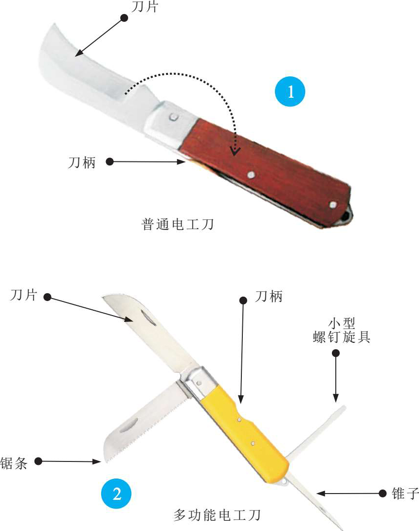 电工刀是由刀柄和刀片两部分组成的。常见的电工刀主要有普通电工刀和多功能电工刀。