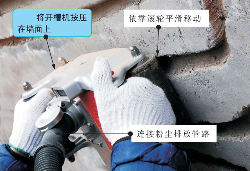 在使用开槽机开凿墙面时,首先应将粉尘排放口与粉尘排放管路连接好,然后用双手握住开槽机两侧的手柄,开机空转运行。