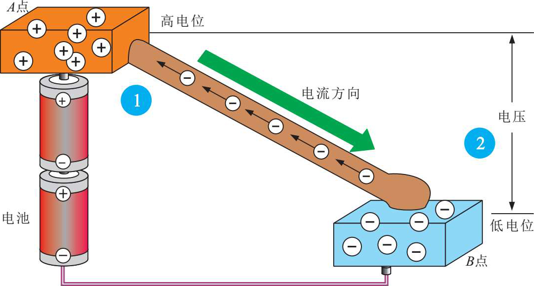 2 电压的方向为高电位指向低电位。