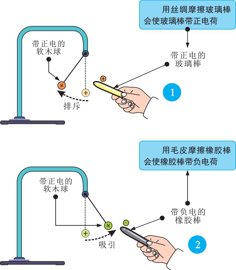 2 当使用带负电的橡胶棒靠近带正电的软木球时会相互吸引。