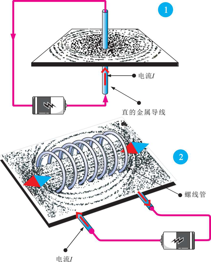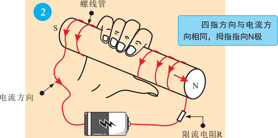 2 通电的螺线管也会产生出磁场。在螺线管外部的磁场形状和一块条形磁铁产生的磁场形状是相同的,判别磁场的方向也遵循右手定则。
