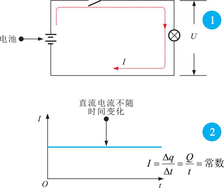 2 在直流电路中,直流电流 I 与时间 t 的关系在 I t 坐标系中为一条与时间轴平行的直线。